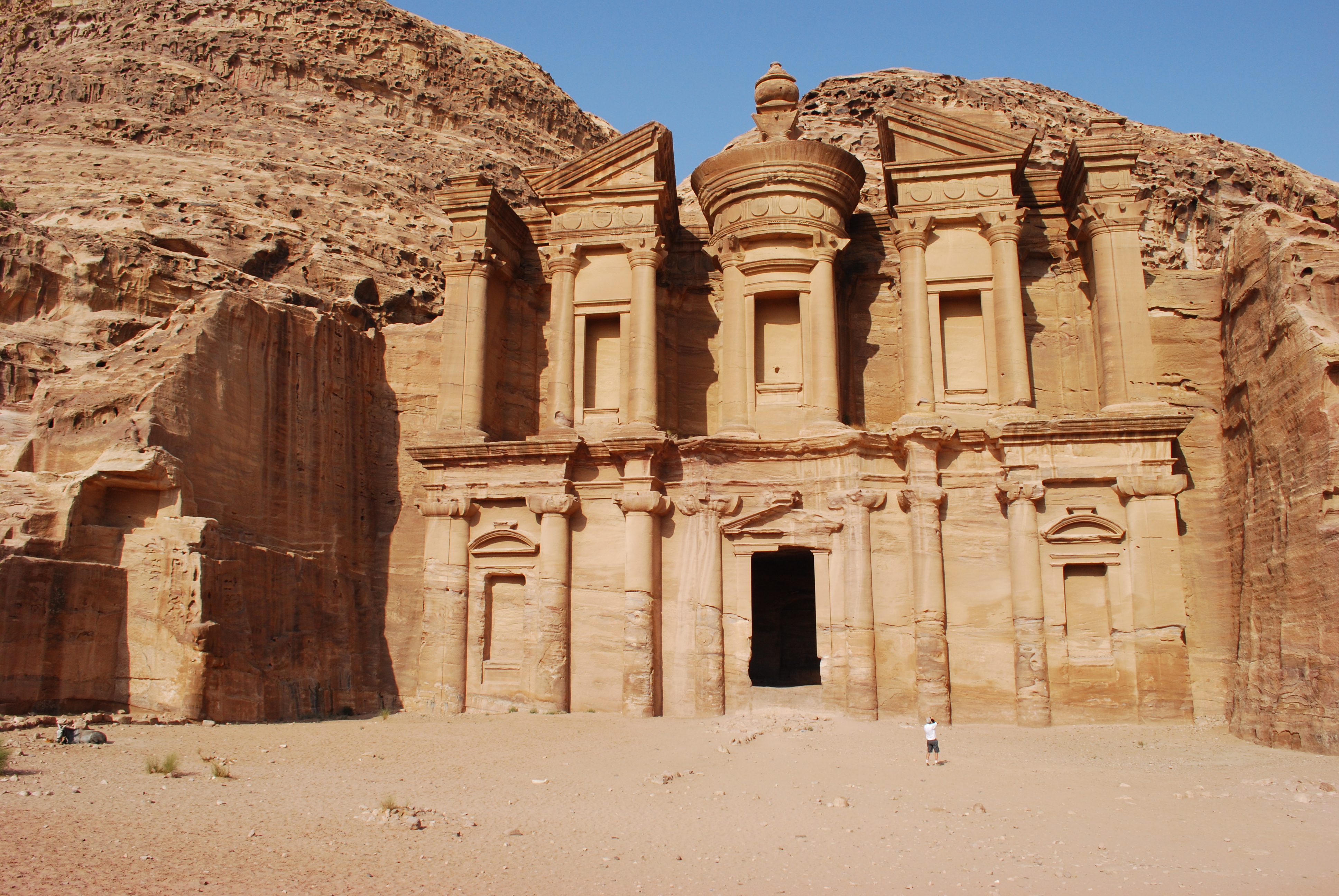 Lo que hace única a Petra es su arquitectura excavada directamente en la roca arenisca. El Tesoro (Al Khazna), con su imponente fachada de 40 metros de altura, es el monumento más emblemático. Aunque su función exacta sigue siendo objeto de debate, se cree que pudo ser una tumba real o un templo. Otro destacado es el Monasterio (Al Dayr), una estructura monumental que, durante la época bizantina, fue utilizada como iglesia. Ambos reflejan la maestría de los nabateos en la talla de piedra y su capacidad para fusionar estilos arquitectónicos helenísticos y orientales.